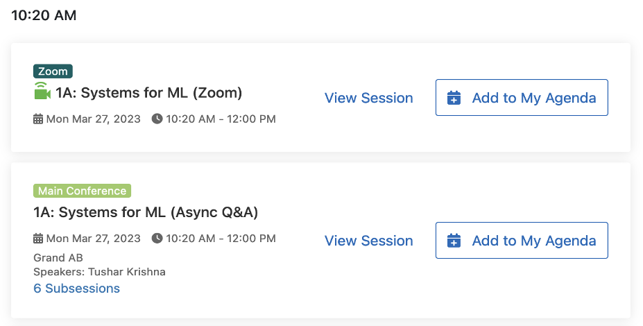 For each paper session in the conference on Whova you will see two “Sessions” in Whova – one labeled Zoom and the other labeled Main Conference. We have separated live-stream and Q&A functionalities into two separate sessions due to limitations of the current Whova user interface.