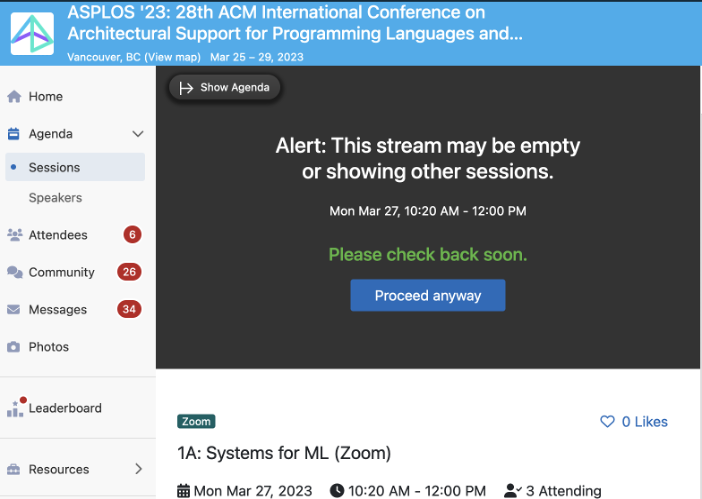 These steps apply to you if you registered for ASPLOS 2023 as a “remote” attendee. Please access the live stream of the program and asynchronous Q&A for individual papers via Whova at https://whova.com/portal/webapp/aaica_202303/Agenda. For the best remote experience we recommend using a laptop or desktop computer.
