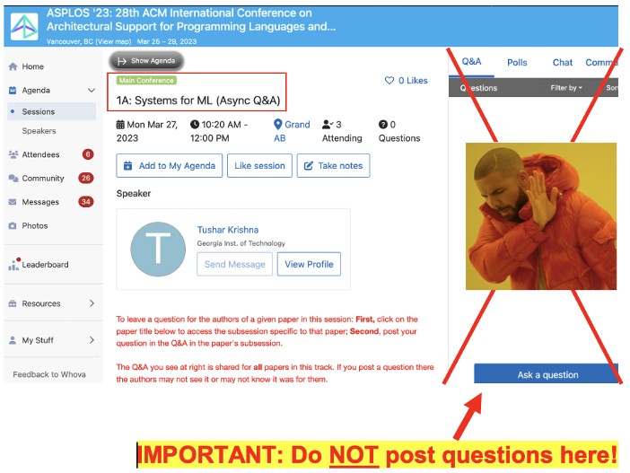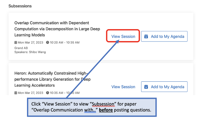 Do not post questions on the right side when you are in the above view. Instead, note that each Main Conference includes a separate “subsession” for each paper. To leave a question for authors, it is important that you first click through to the “subsession” for their paper by clicking on the “View Session” link for the paper as shown in the illustration below.